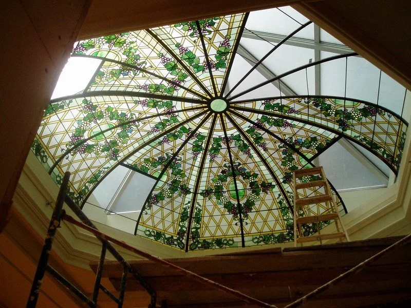 The Studio performs all restoration services including on-site evaluations, access to all windows and laylights, emoval and extradition of stained glass panels and sashes, transport and in Studio restorations. In situ restoration of stable condition stained glass windows and sashes is also performed.